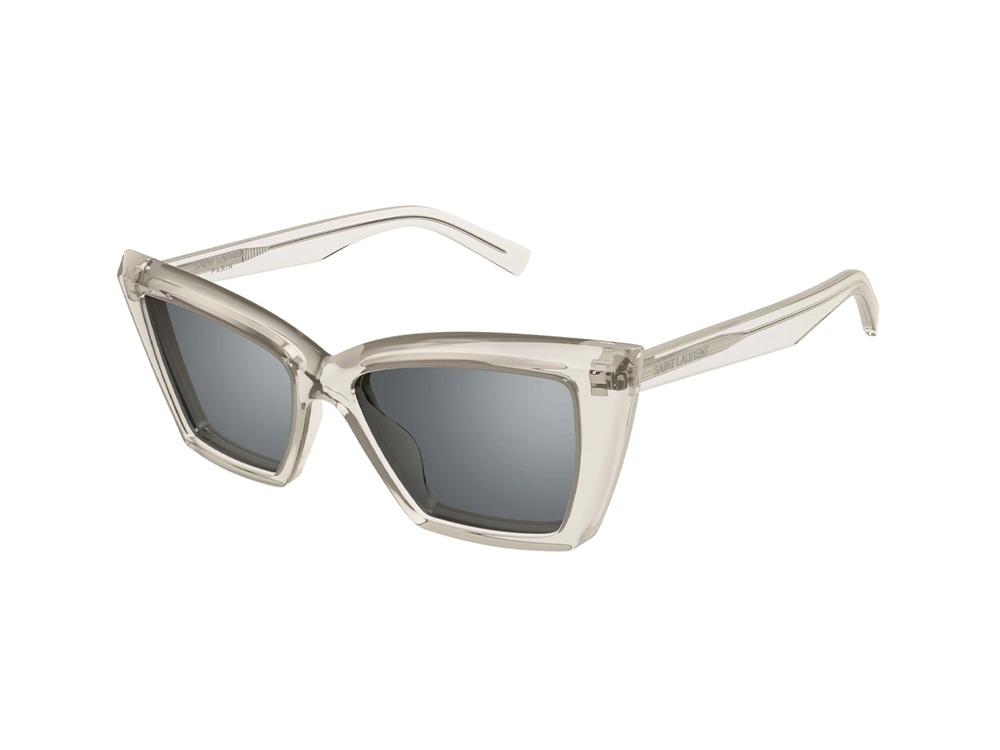 Gli occhiali da sole Saint Laurent 657 hanno montatura in acetato colore TRASPARENTE, l'occhiale monta lenti organico, colore GRIGIO tinta unita Cat. 3.